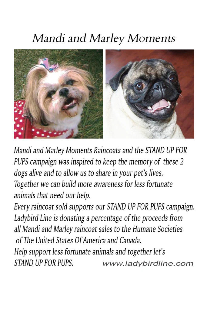 Join us in making a difference! Dress your dog in style while supporting a noble cause. Get the Mandi and Marley Moments Raincoat today – because every pup deserves to stand out and stay dry!